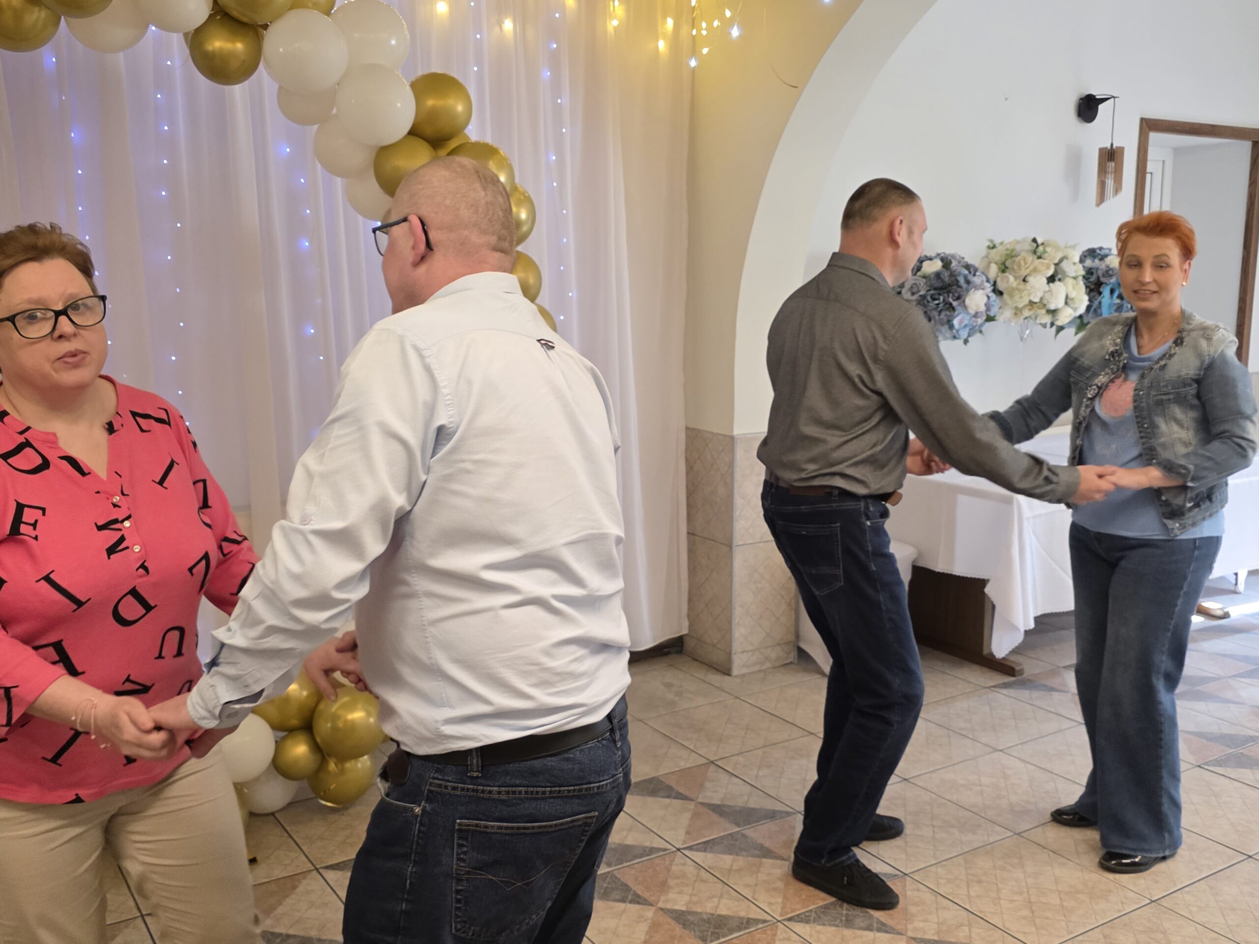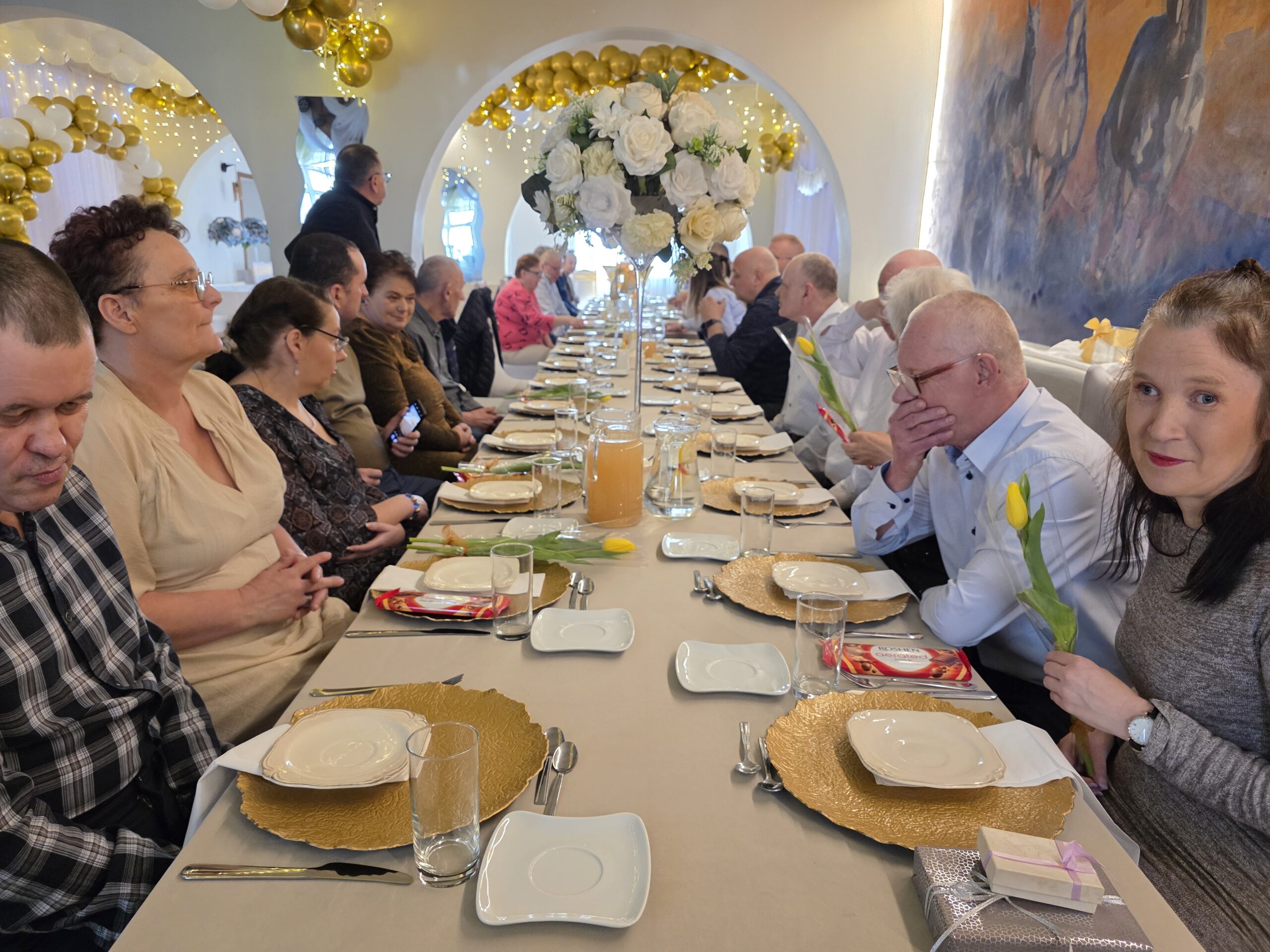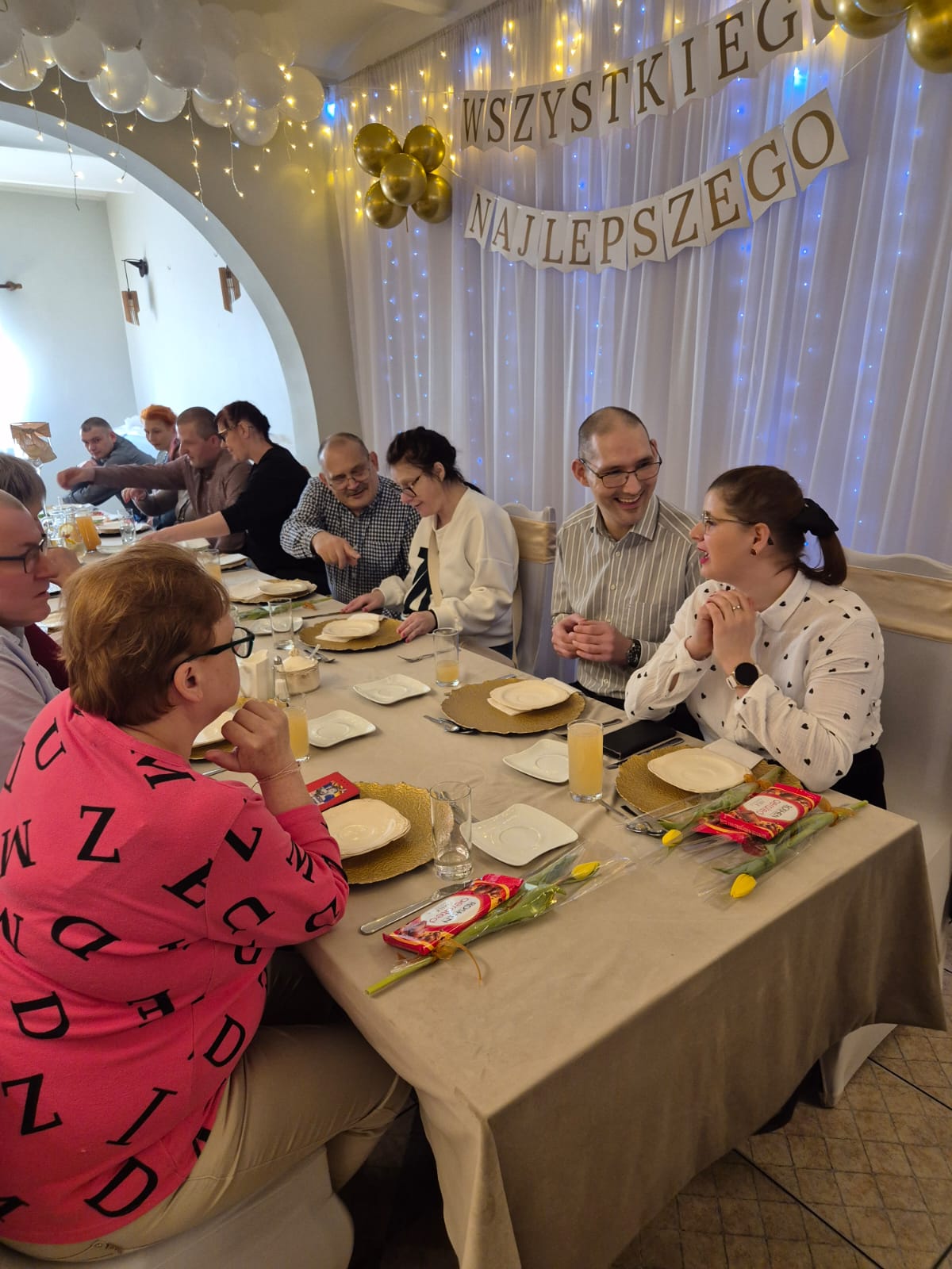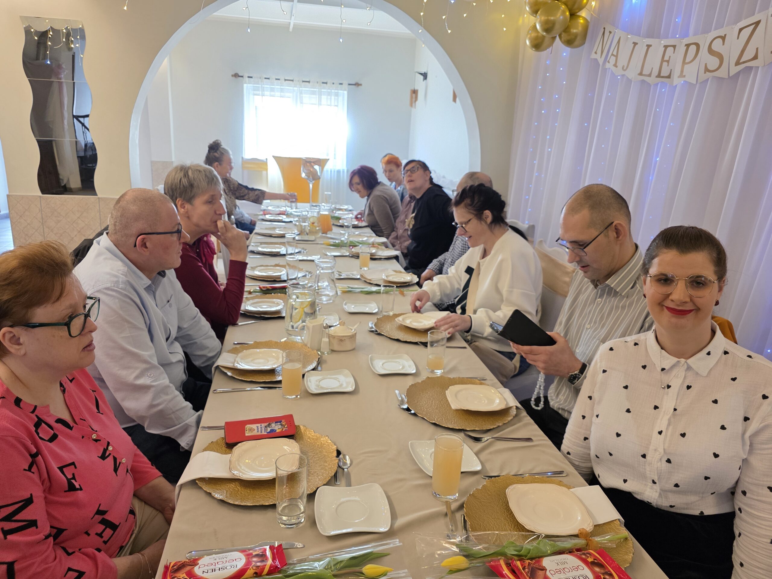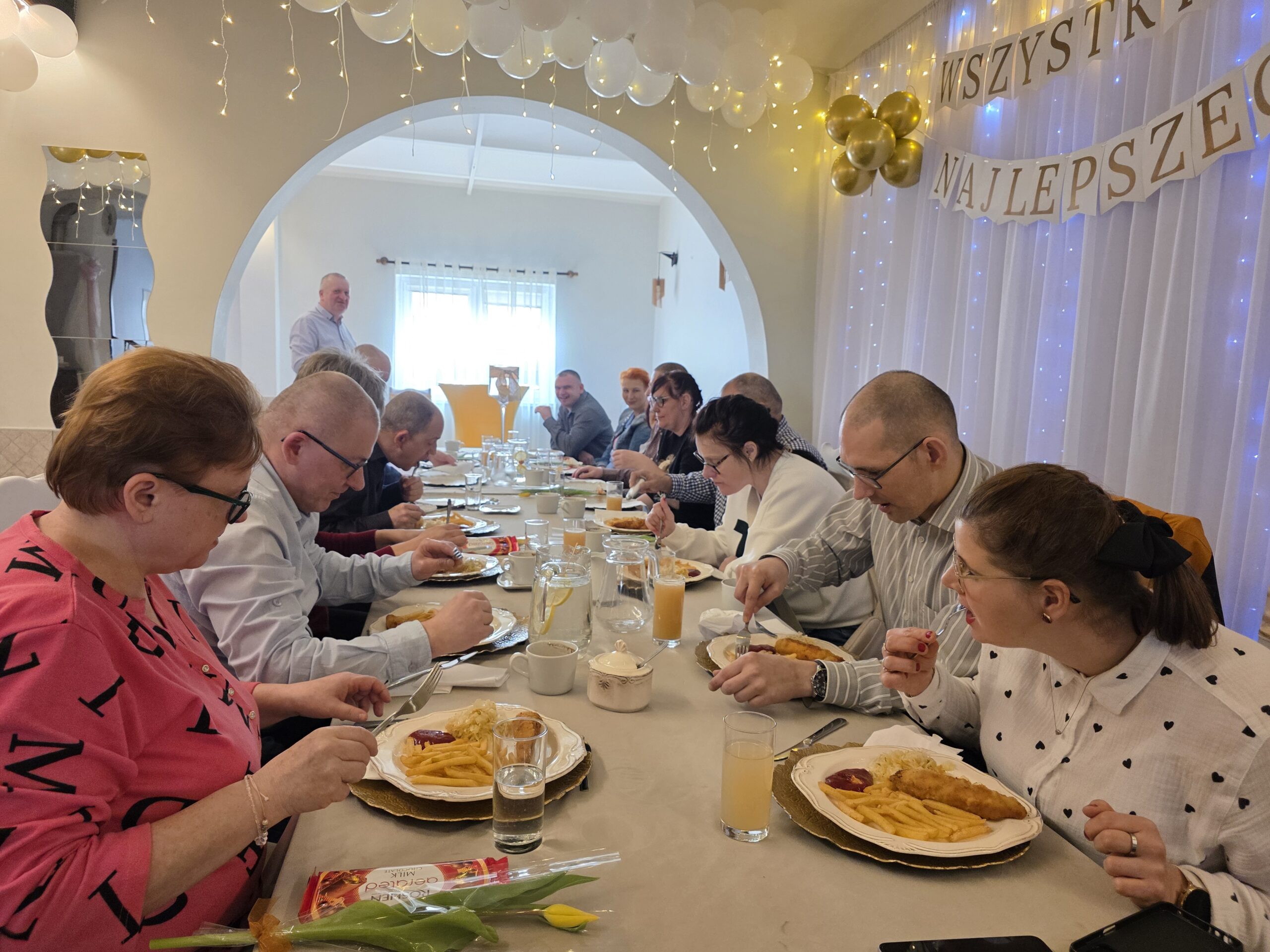 W tym roku spotkanie odbyło się 10 marca w godzinach 11⁰⁰ – 13⁰⁰, a okazją były dwa ważne w naszej kulturze święta: 8 marca Dzień Kobiet oraz 10 marca Dzień Mężczyzny. Tego dnia aż czternastu naszych Panów – mieszkańców –  spotkało się z Paniami. Jak zwykle czekał na nich pięknie przystrojony stół, na którym pojawił się pyszny obiad. Po nim biesiadnikom podano kawę i deser lodowy. Świąteczną atmosferę tworzyła też muzyka. Nikt nawet się nie spodział, kiedy muzyka poderwała wszystkich do tańca. Pary ruszyły na parkiet i pięknie się bawiły.